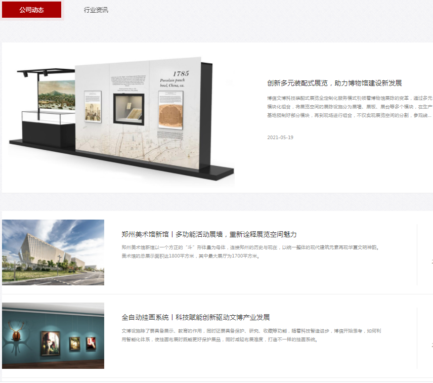 首頁(yè)主要分為四大部分:關(guān)於博信、產品中心、案例展(zhǎn)示和新聞動態。其中在關於博信部(bù)分增加了博信的介紹短片,更為生動地展示了博信的產品體係、生產車間與企業文化等。而在(zài)產品中心方麵,則分為文博展櫃、展(zhǎn)覽裝(zhuāng)配與專業設備三大類(lèi),點擊即(jí)可到(dào)達相應頁(yè)麵。案例展示則列出(chū)了博信完成的部分項目,而新聞動(dòng)態(tài)則展示(shì)了博信產品、案例(lì)和其它資訊。